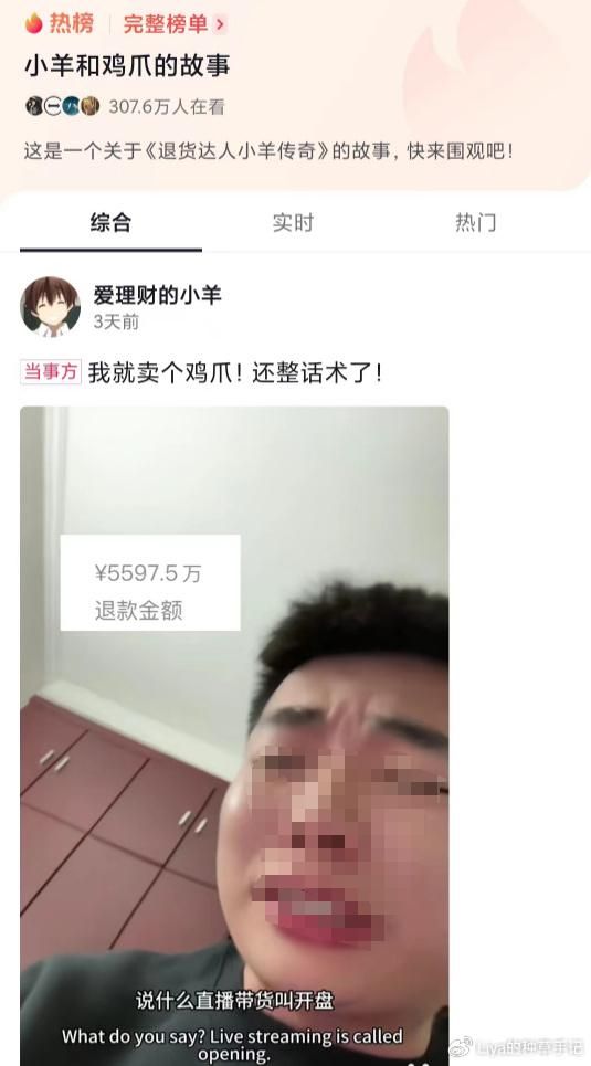 事情是这样的,“爱理财的小羊”(下称小羊)本是名财经博主,每天拍视频晒出自己的炒股盈亏,辅以浮夸表情,俗称“财经乐子人”。当然了,炒股盈亏肯定是涨的少,跌的多,单日动辄数万的亏损看的大家是心情大好。毕竟粉丝们自己也都在亏,但看到小羊亏得更多,瞬间就没那么难受了。这大概就类似于:自己的失败固然可怕,但朋友的成功更令人揪心。后来在自己狂亏的账单轰炸下,小羊也逐步累计了50万粉丝,这时候他想着,亏了好几十万,不如直播带货回点血?但正是这个决定,让一代“退货一哥”就此诞生。在小羊直播间,核心商品是一款去骨鸡爪,带货第一天,整场直播一共卖了6万元,但万万没想到第二天小羊起床后发现,退货金额就高达5.8万元。???97%的退货率直接给小羊干懵了,不过这时候他还没有意识到事情的严重性。带货第二天,销售额78万,退款77万;第三天销售额212.9万,退款213.7万,甚至把之前买的都退了,退货率高达100%。