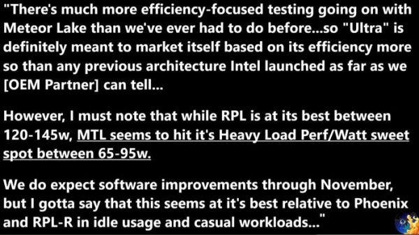 MLID 还分享了关于英特尔 Meteor Lake 处理器功耗相关的信息。IT之家从视频中获悉,Meteor Lake Ultra 处理器的主要卖点之一是功耗,功耗在 65W-95W 之间,而作为对比 Raptor Lake 移动 CPU 在 120W-145W 左右。