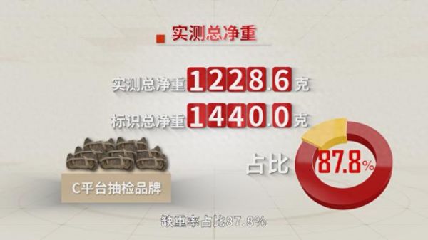 C平台某品牌大闸蟹实测总净重1228.6g,标识总净重1400.0g,缺重率占比87.8%;