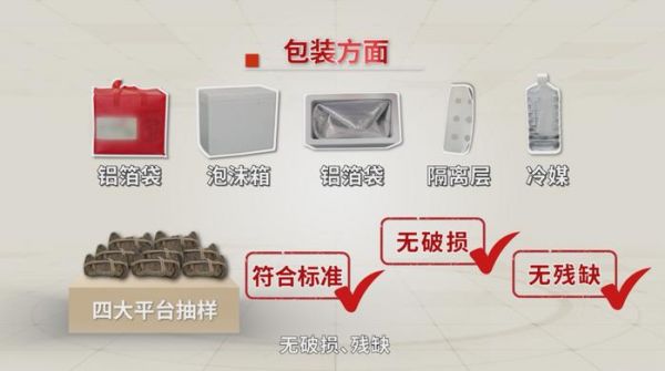 包装方面,看上去都还说得过去,毕竟都是大平台,包装上用了铝箔袋、泡沫箱、铝箔袋、隔离层、冷媒,标准化的包装流程,也没有破损残缺,在包装成本上,大家都是舍得投入的。