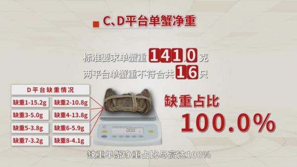 C、D平台某品牌大闸蟹标准要求单蟹重141.0g,单蟹重不符合8只,总数8只……