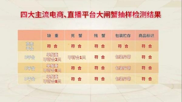 不测不知道,四大主流电商、直播平台的大闸蟹,在缺重、死蟹、包装储存等方面,也会有部分样品不合格。(PS:天生脸皮薄,还怕得罪人,我就不具体提及电商平台名称了,后文权且用B、C、D代替,请勿对号入座)