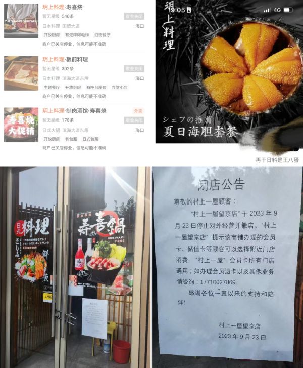 根据内参君走访发现,9月底开始日料品类迎来又一波“大规模关停及闭店”。海口网红日料品牌玥上日料9月底开始出现“大面积关店”,目前其大众点评门店信息均已变更为歇业关闭,其创始人在微信签名上写道:“再干日料是王八蛋”;村上一屋望京店也于9月贴上了“闭店公告”,开始转型探索“亚洲融合菜”……