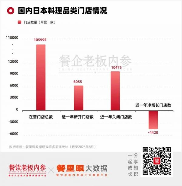 根据餐里眼数据研究院多渠道统计显示,截至2023年8月,国内日本料理品类在营门店总数量达到105995家,其中近一年新开门店数量为6055家,近一年关闭门店数量为10475家,缩减数量达到4420家。