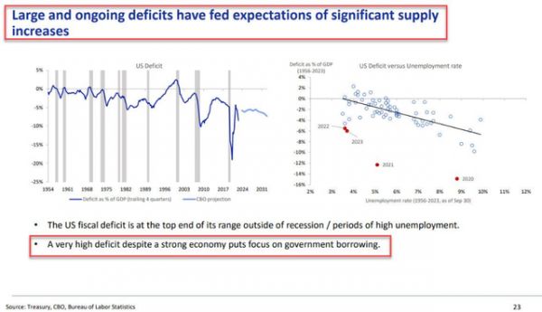 除经济衰退/高失业率时期之外,美国赤字处于其范围的上限,这使美债供应成为焦点(近期美债收益率主要由于期限溢价上行);