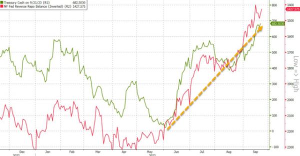 但这些现金的大部分并非来自银行资产负债表,而是来自存放在美联储逆回购的1万多亿美元,随着美债发行/财政部现金的爆炸性增长,其美联储逆回购总额已大幅缩水。