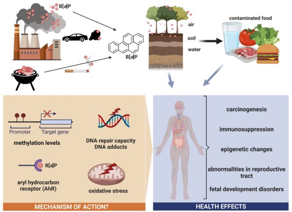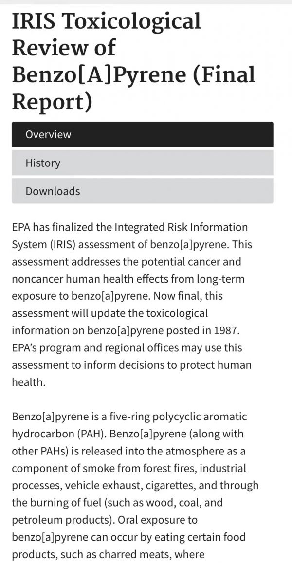 2017年,美国环保局发布苯并芘毒理学审查,对多种动物物种的研究表明,苯并芘通过所有接触途径易在多个肿瘤部位(消化道、肝脏、肾脏、呼吸道、咽部和皮肤)致癌。此外,有强有力的证据表明,接触含有苯并芘的多环芳烃混合物的职业具有致癌性,例如铝生产、扫烟囱、煤气化、煤焦油蒸馏、焦炭生产、钢铁铸造、铺路等。越来越多的职业研究表明,累积苯并芘暴露与肺癌之间存在正暴露—反应关系。
