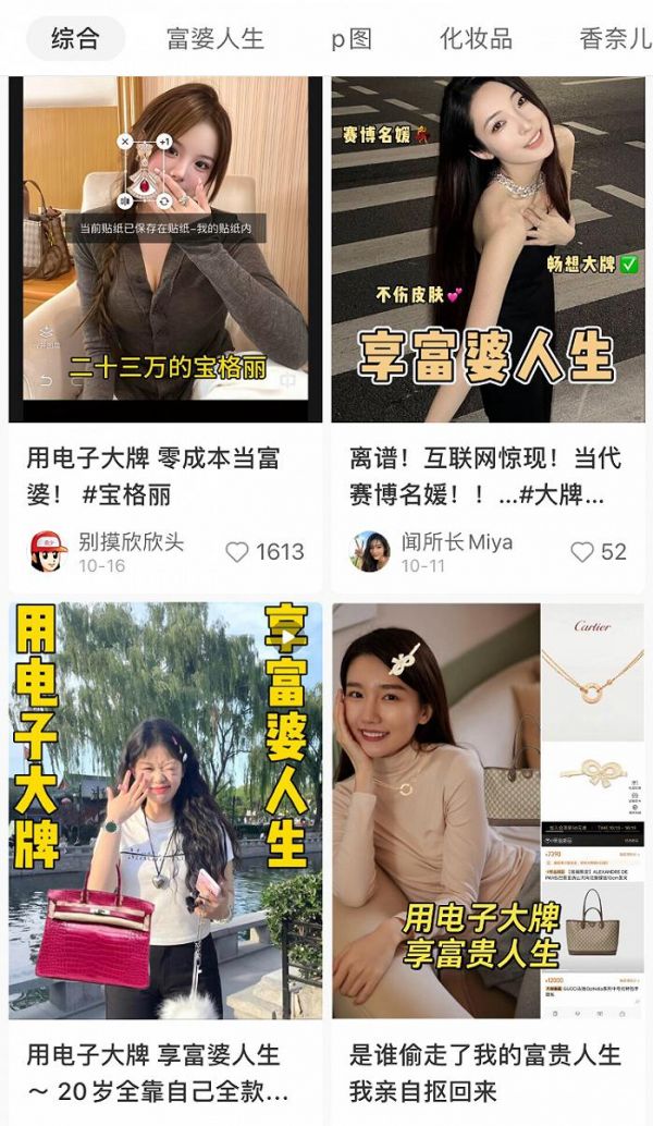 图源小红书“大牌有没有不重要,关键是照片可以一直保留,不香嘛”“富哥富姐那么多,不能少了我”,刚毕业不久的Coco(化名)谈到使用“电子大牌”的想法。紧接着,“用电子大牌,享富贵人生”的观念逐渐蔓延开来,P图也随之变得奇怪起来。
