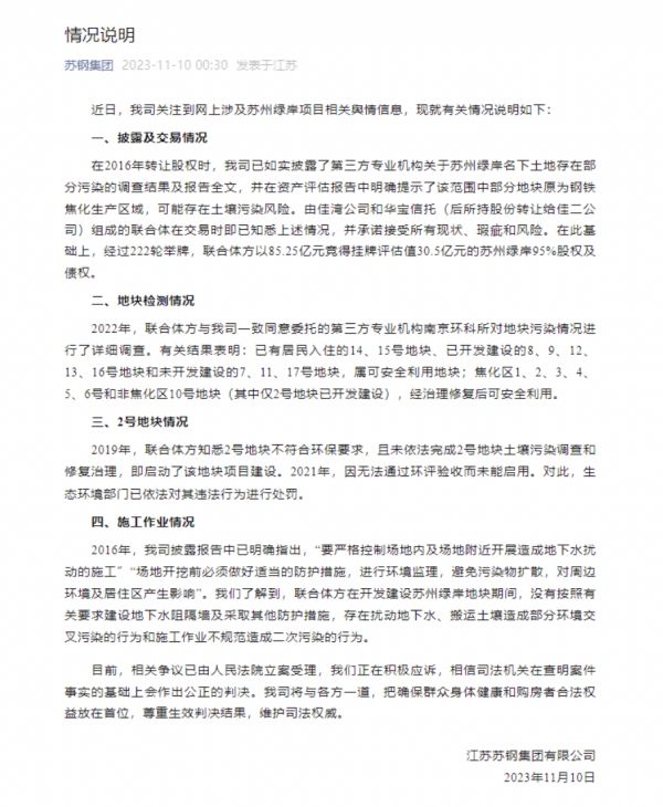 据苏钢集团官方微信号,11月10日凌晨发布情况说明,全文如下: