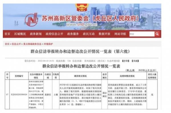 苏州市高新区管委会官网一份“群众信访举报转办和边督边改公开情况一览表”显示,苏州高新区(虎丘区)生态环境局接交办问题,苏州市高新区浒墅关苏州绿岸项目17幅土地,用地面积约66万平方米,第三方检测机构检测结果显示多处地块土壤中苯并芘、萘严重超标,不符合用地标准。