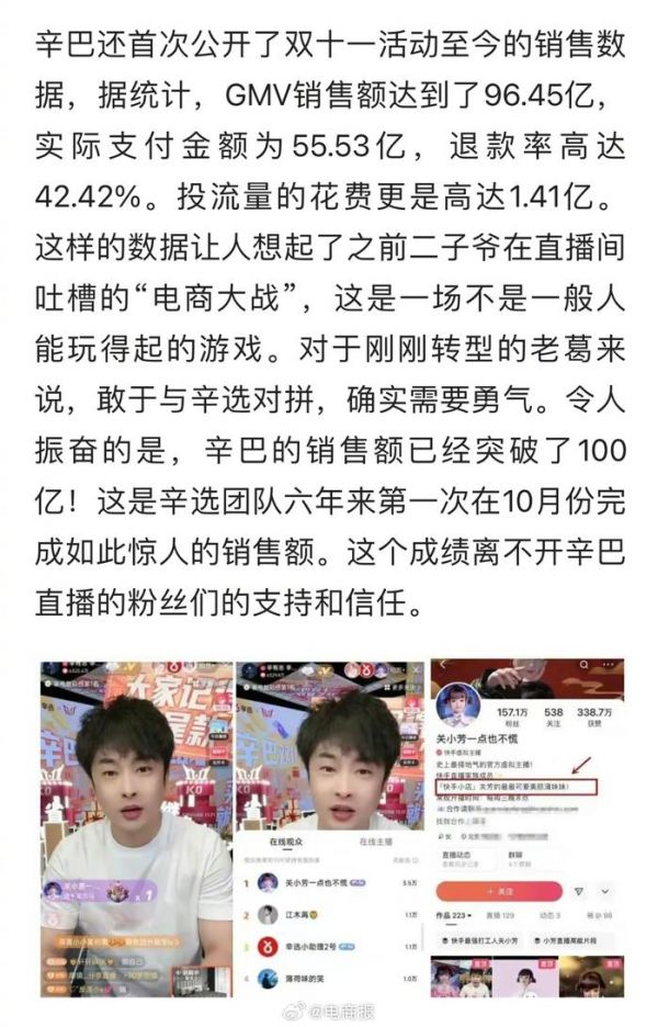 辛巴公开双11后台带货数据,10月份GMV已破百亿,退款率42.42%……