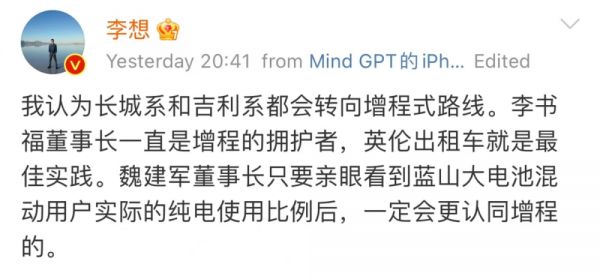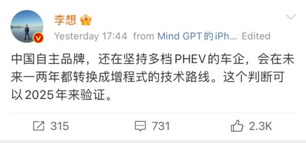 需要澄清一下,李老板原微博其实没直说PHEV将被淘汰的话,他第一条微博提到的是“坚持多档PHEV的车企”,3小时后又补充的一条微博,点名的也是采用2档路线的长城、和3档路线的吉利,全程没有提比亚迪为代表的单直驱档位PHEV路线。