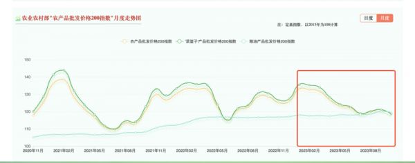 事实上,尽管今年以来极端气候明显增多,但鲜菜、水果、生猪等食品价格并不理想。农业农村部的数据显示,农产品批发价格200指数从年初开始持续走低,8、9两月虽有小幅回升,但10月再度走低至年内最低点118.69。