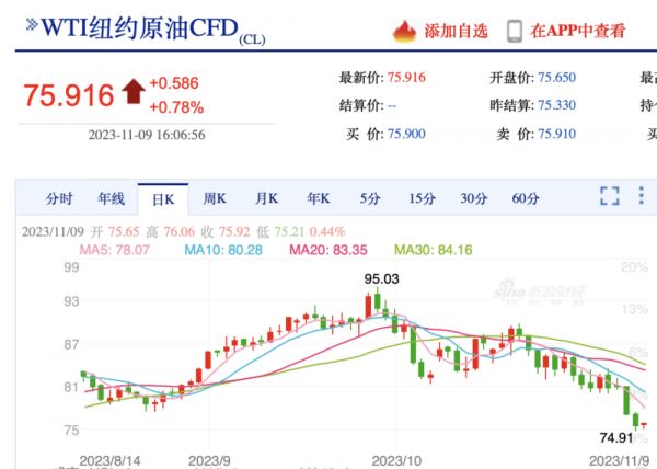 目前,WTI纽约原油价格已经从9月的最高点95.03美元/桶,跌至当前的75美元/桶附近。NYMEX原油、ICE布油期货主力合约尾盘更是在11月7日至8日,一天内跌逾近4%。