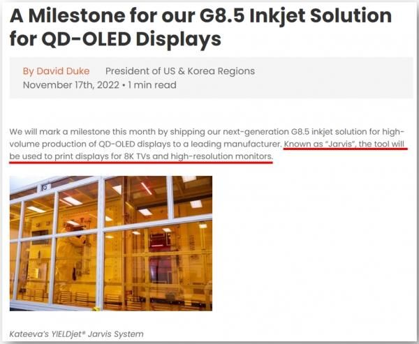 HB Solution去年11月与三星显示器公司签署了喷墨设备供应合同。与预计的 2021 年底交付相比,这也晚了大约一年。去年11月,Kateeva在其博客上发布广告称,它将通过推出“用于量产QD-OLED显示器的下一代第8.5代喷墨解决方案”来标志着一个里程碑,但几天后删除了该内容。当时,Kateeva 预计,Kateeva喷墨设备将用于 8K 电视和高分辨率显示器。