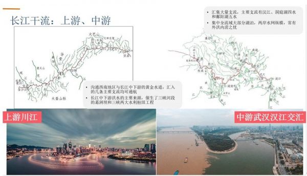 下面,再通过这几张图片跟大家介绍一下长江的情况。上游的金沙江,与怒江、澜沧江形成“三江并流”奇观,其云南部分已列入世界自然遗产名录。还有著名的虎跳峡等,这都是上游的一些地质奇景。这里支流众多,流域面积在1万平方千米以上的支流就有9条,并且水量丰沛,水能资源丰富,理论蕴藏量占长江总量的45.25%。
