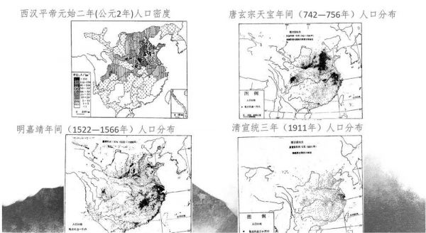 南北人口比重逆转:大家看这张图里面,它的颜色越深,人口密度越大。唐玄宗天宝年间,北方人口还是很多的,但是到了明清,江南地区人口密度就更大了,特别是长江中下游地区,人口占明显优势。到现在,大部分人口都在南方,长江流域是养活人口最多的一个地方。