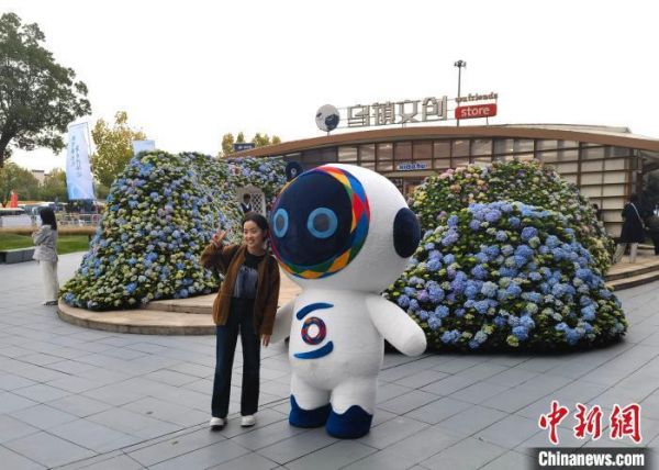 “互联网之光”博览会会场外,一位参展者与“小互”合影。王逸飞 摄中新网乌镇11月9日电 (王逸飞)2023年世界互联网大会乌镇峰会此间正在浙江乌镇举行。峰会期间,乌镇峰会吉祥物“小互”成为大家追捧的对象,其周边产品也迎来销售高峰。记者了解到,目前“小互”IP周边产品开发种类已超70种。