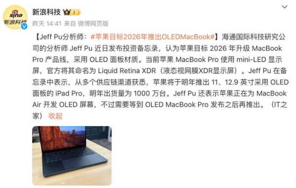 海通国际科技研究公司的分析师 Jeff Pu 近日发布投资备忘录,认为苹果目标 2026 年升级 MacBook Pro 产品线,采用 OLED 面板材质。当前苹果 MacBook Pro 使用 mini-LED 显示屏,官方将其命名为 Liquid Retina XDR(液态视网膜XDR显示屏)。