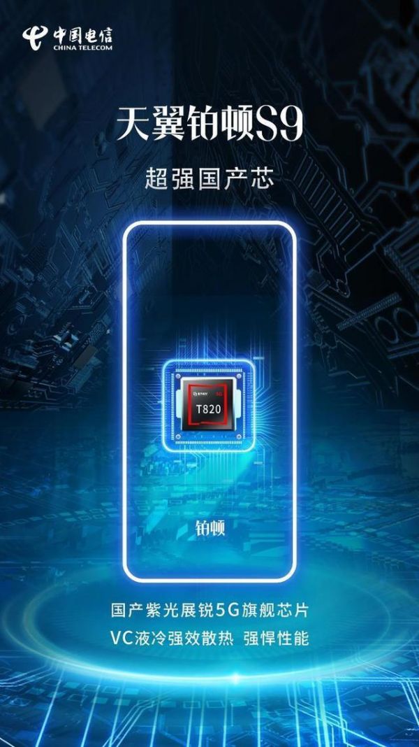 天翼铂顿S9搭载国产紫光展锐T820 SoC,采用台积电6nm工艺,CPU部分包括一个2.7GHz A76大核、三个2.3GHz A76大核、四个2.1GHz A55小核,3MB三级缓存,集成Mali-G57 MC4 GPU,频率850MHz,配备旗舰级的VC液冷散热系统。