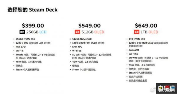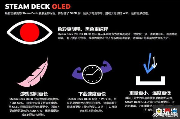 Steam Deck OLED采用了一块新的比原版更大的7.4英寸90Hz刷新率OLED屏幕,Valve称新的OLED屏幕能够带来更明亮的颜色与更黑的黑色,同时新屏幕也支持HDR。除了屏幕之外,Valve对Steam Deck的各方面都进行了一定增强。Steam Deck OLED使用了更省电的OLED屏幕与更大的电池,能够令Steam Deck OLED续航时间提高30~50%,新机型使用了WiFi 6E通讯技术保证更高带宽与延迟。同时Steam Deck OLED设置了更大的风扇,与新设计的散热元件。原本玩家们吐槽的容量问题,Valve推出Steam Deck OLED新机型时只有512GB与1TB两种版本,当然钱是不会少要的。