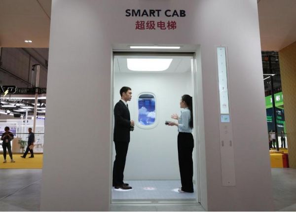 工作人员(右)向参观者介绍超级电梯 方喆 摄在技术装备展区,全球电梯行业龙头奥的斯就带来这样一款概念式的超级电梯。半月谈记者在现场看到,超级电梯配备了两块液晶显示屏,可以显示电梯空间是否拥挤、电梯内是否有宠物等各种个性化信息。同时,电梯为乘客提供定制化的照明和感官设置,乘客离开电梯时,轿厢内的灯光和显示屏亮度会自动变暗,氛围变化的同时更为节能。