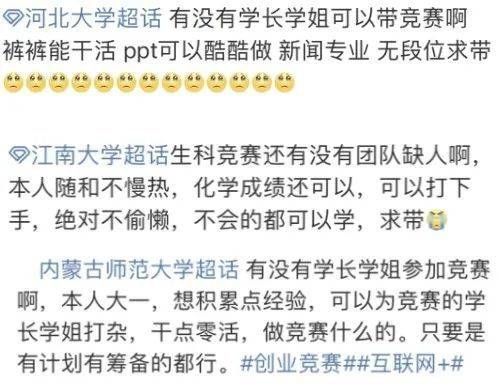 打开各个学校的超话,经常会有大一大二的学生宁可打下手干杂活,也要苦苦求前辈大神带竞赛、带项目。