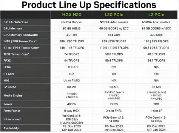 规格文件中显示,英伟达即将向中国客户推出新产品分别名为HGX H20、L20 PCle、L2 PCle,基于英伟达的Hopper和Ada Lovelace架构。从规格和命名来看,三款产品针对的是训练、推理和边缘场景,最快将于11月16日公布,产品送样时间在今年11月至12月,量产时间为今年12月至明年1月。
