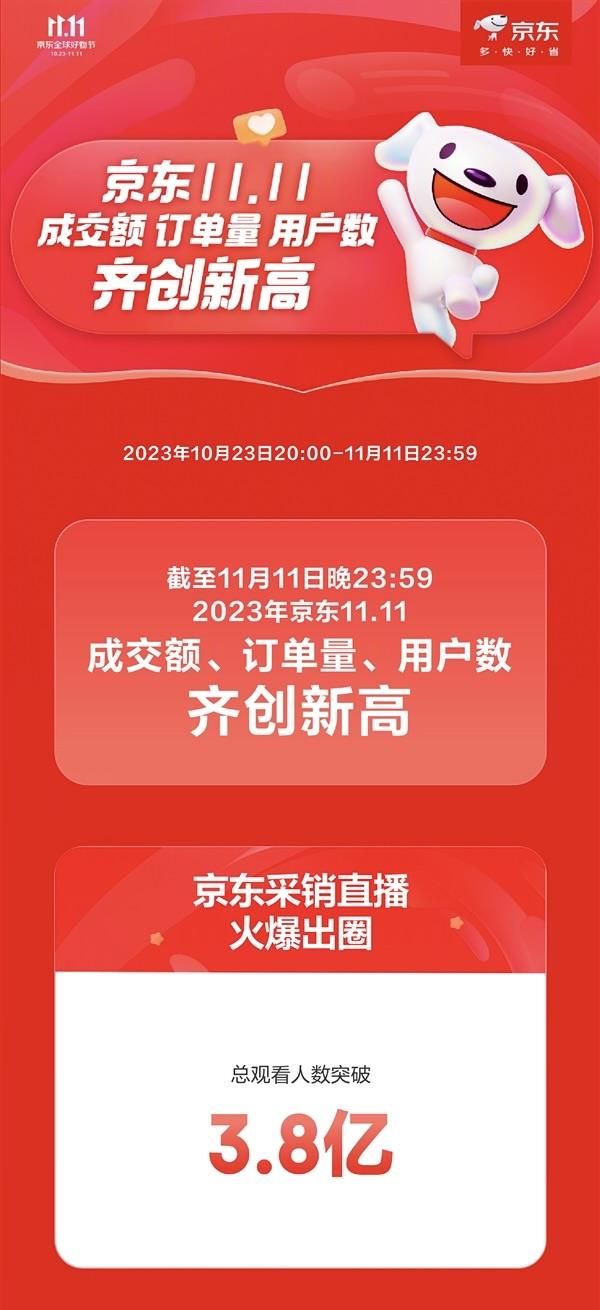 在这次的战报上,京东在第二栏强调了双 11「3.8 亿」的京东采销直播总观看人数。与其同时,「京东采销直播」也是京东在开放日强调的重点。