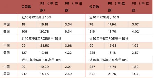 第三,比较中美这些优质上市公司的估值水平,发现最优质公司(连续10年ROE高于15%)中,美国的估值水平偏高,次优质公司(10年中有8年和5年ROE高于15%)中,中国的估值水平高于美国,但差异不大。