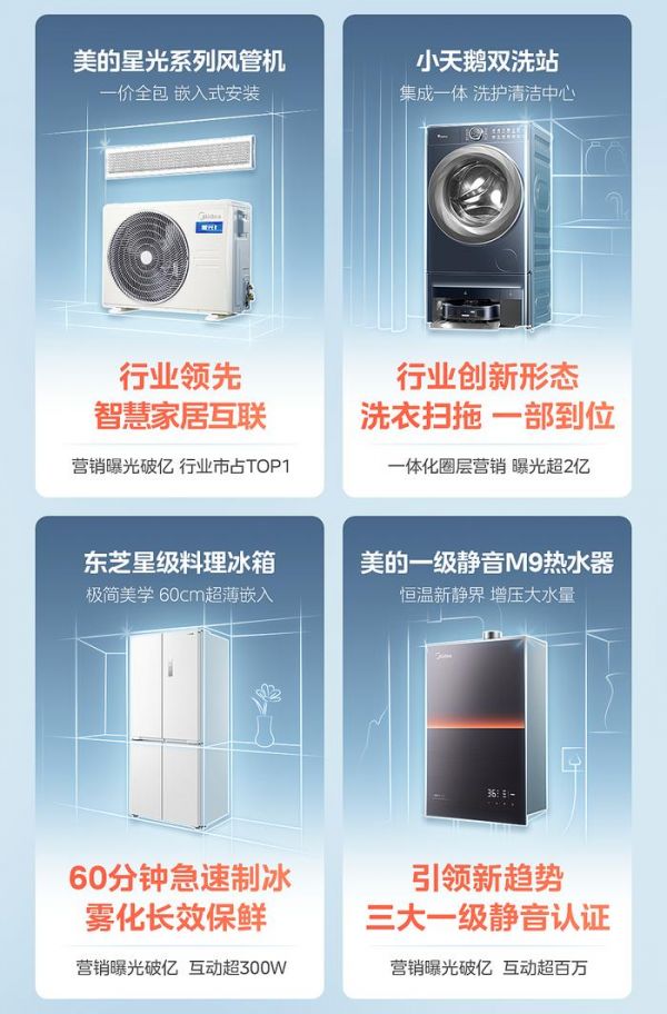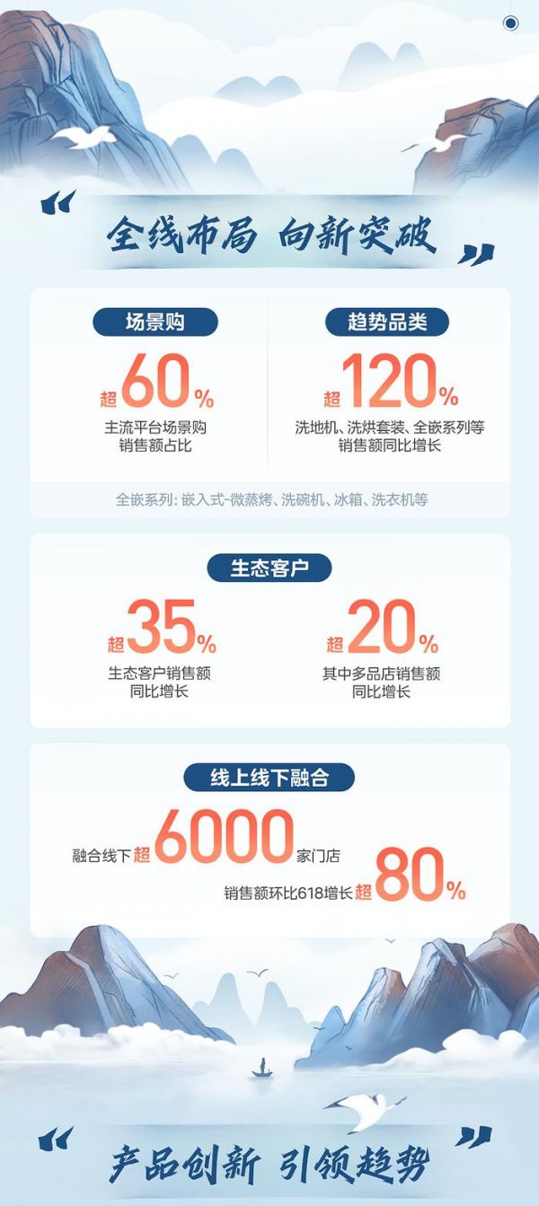 据悉,主流平台场景购销售额占比超 60%,洗地机、洗烘套装、全嵌系列等销售额同比增长超 120%。美的系品牌融合线下超 6000 家门店,销售额环比 618 增长超 80%。
