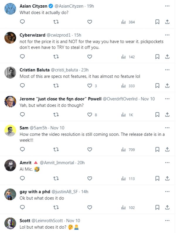 这一演示失败几乎是致命的——一个本就缺乏刚性使用场景的产品,在有限的演示上误导了用户,其产品价值顿时变得无比模糊。果不其然,发布会刚刚结束,AI Pin 就被国外网友广泛吐槽。
