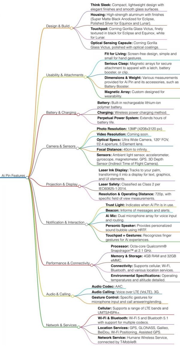 AI Pin 发布后,MindBranches 用 GPT 快速盘点了所有发布核心信息,并生成了一张思维导图,贴在了相关推特的评论区中: