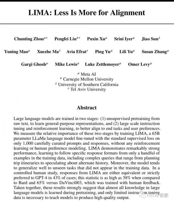 Mata公司的研究人员发现,只使用1000个高质量的样本数据进行微调,在没有任何强化学习或人类偏好建模情况下。65B的LLaMA模型表现出非常优异的性能。这对我们做大模型应用的人当然是福音,在领域中不缺少高质量数据。论文认为模型的知识和能力几乎完全是在预训练期间学习的,而有监督微调(SFT)则教会它在与用户互动时应该使用哪种子分布的格式,少量高质量数据就能达到预期效果。这看起来和人类少量数据就能学习有些相似。