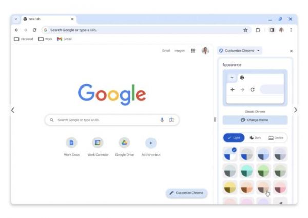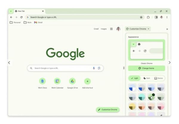 与此同时,颜色在这次 Material You 设计重塑中起到了重要的作用,新设计采用了新的色彩组合,“更好地衬托了你的标签和工具栏”。在新标签页上,点击“自定义 Chrome”可以尝试不同的色调。