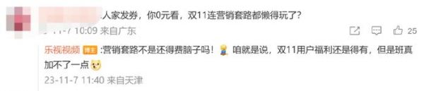 在乐视双11活动公告的微博评论区里,有网友问道:“人家发券,你0元看,双11连营销套路都懒得玩了?”乐视给出的回答是:“营销套路不是还得费脑子吗!咱就是说,双11用户福利还是得有,但是班真加不了一点。”语气态度活脱脱就是躺平打工人的既视感。
