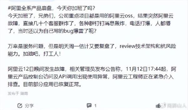 对此,不少阿里云的使用方都在吐槽业务崩溃、被工作群的消息轰炸,还以为自己写的bug爆雷了。如果这次故障按照SLA赔偿(如服务可用性低于 99.95%,用户可获得月度服务费 10%、25%、100% 不等的赔偿),企业端的服务估计可以获赔一大笔金额,毕竟对业务的影响是实实在在的。