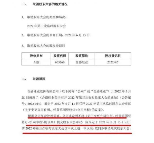 但数天后,2022年6月8日,合盛硅业发布了取消2022年第三次临时股东大会的公告,表示根据公司经营管理需要,决定暂不将前述公告提到的关于变更公司住所相关议案提交股东大会审议,同步取消此次股东大会。