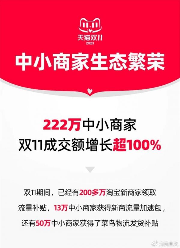 双11期间,200多万淘宝新商家领取了流量补贴,13万中小商家获得了新商流量加速包,菜鸟物流补贴也覆盖了50万淘宝中小商家。