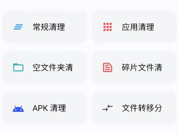 功能分为常规清理、应用清理、空文件夹清理、碎片文件清理、APK清理和文件转移分类。