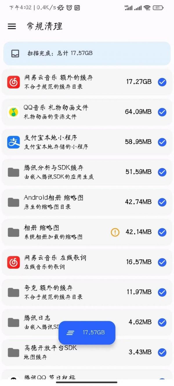 一般情况下,我们可以使用常规清理即可。点击后,工具会自动扫描应用内的数据,扫描完成后,可以选择需要清理的文件。