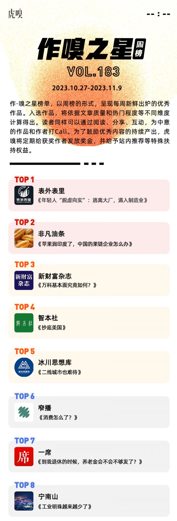 作·嗅之星榜单,以周榜的形式,呈现每周新鲜出炉的优秀作品。2023年10月27日~2023年11月9日,虎嗅第183期作·嗅之星的获奖文章分别是: