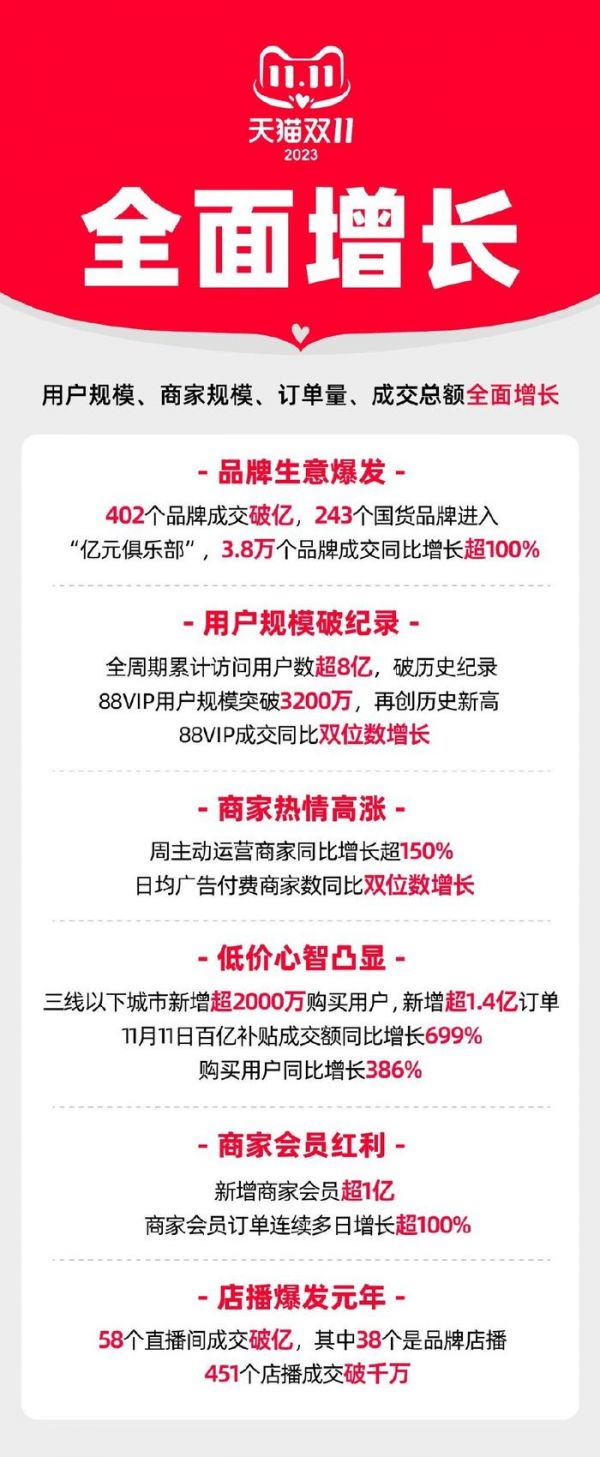 可以看到,2023年的天猫双11仍在全面增长。