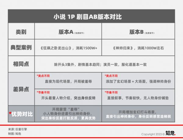 同一剧本为了提升测出率,会设计成 AB 两个版本 ( 免费章节 ),制作团队会提高小成本预算,通过设置不同的爽点,在付费章节之前翻拍两个版本,营造出人物差、故事差,打造不同的反转,形成差异化,吸引用户付费。