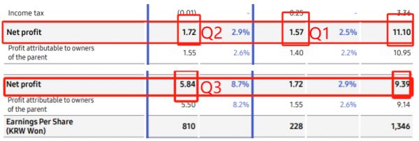 这不是三星电子本年度净利润下滑最为严重的一个季度,今年第一,第二季度,三星电子的净利润下滑程度更为严重。其中,第二季度三星电子净利润1.72万亿韩元,较上年同比下滑84.50%;第一季度,三星电子净利润1.57万亿韩元,较上一年同期同比下滑86.13%。