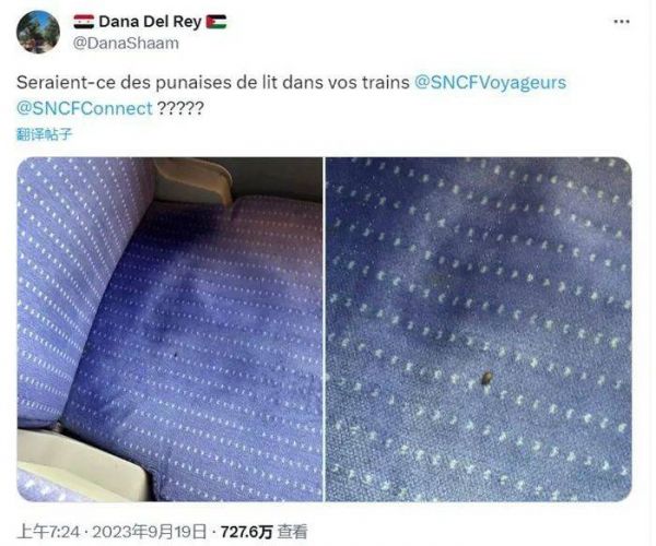 火车坐垫上发现臭虫 图片来源:X