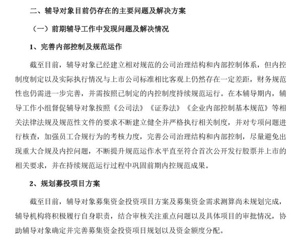 报告显示,辅导期内,辅导机构持续开展尽职调查工作,督促辅导对象进行规范运作,指导辅导对象规划募投项目相关方案。截至目前,辅导对象已经建立相对规范的公司治理结构和内部控制体系,但内控制度制定以及实际执行情况与上市公司标准相比客观上仍然存在一定差距。辅导对象募集资金投资项目方案及募集资金需求测算尚未规划完成。