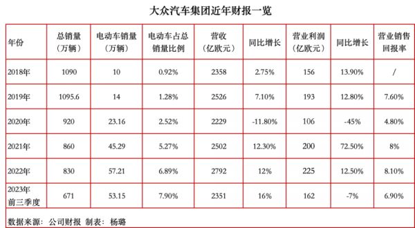 自2018年来,大众新能源车型占总销量的比重在增大,但与比亚迪和特斯拉相比,差距仍然悬殊。最新财报显示,2023年前三季度,大众的电动车全球销量为53.15万辆,占总销量的7.9%;特斯拉全球销量为132.4万辆;比亚迪全球销量超过了200万辆。