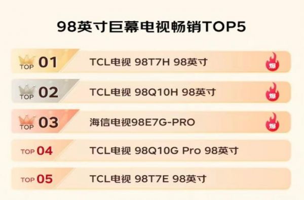 在消费者“买大不买小”的消费理念下,电视市场“越大越好卖”的趋势早已形成。而Mini LED显示的画质优势在大屏电视上可得到更淋漓尽致的释放,这直接助力TCL在多个大屏以及超大屏榜单上独占鳌头。比如98英寸电视畅销榜前三全为TCL Mini LED电视,98T7H拔得头筹,98Q10H和98Q10G Pro分列二三位。