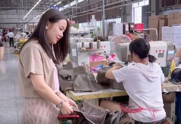 邱敏正在工厂检查女鞋生产中所需的皮料。受访者供图深夜的叫卖声:20个小时“战斗模式”